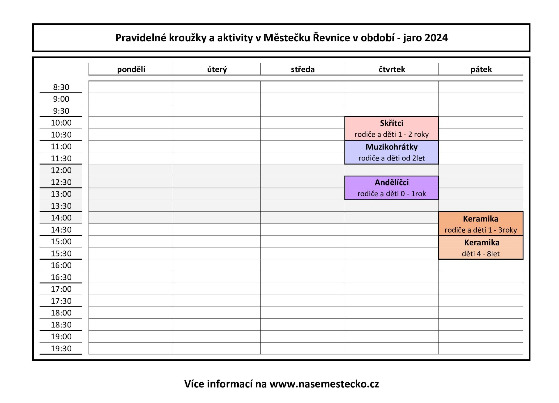 pro aktuální informace ohledně kroužků, včetně obsazeností a možností, pište prosím na e-mail: rezervace@nasemestecko.cz
